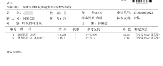 1、患者应有血常规、肝肾功能、相关的血清肿瘤标志物(肿瘤抗原或肿瘤相关抗原)化验检测以及影像学检查结果。