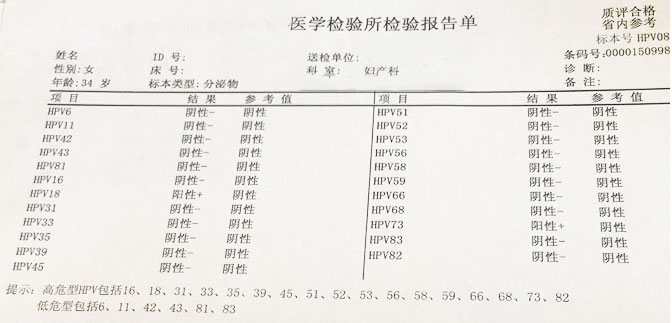 复查结果出来了,HPV 59型虽然转阴了,但不仅HPV 18型还存在,而且还冒出了HPV 73型感染。李女士的心情又跌到底谷,于是向专家求教。专家告诉她,她的复查只接受了HPV的定性检测,这是医院通常采取的HPV检测手段,对疗效判断意义不大。对于定性检测,一百个HPV病毒和一个HPV病毒都是判定为阳性。因此,即使HPV治疗后大量减少,定性检测是无法显示这种变化的。李女士于是将治疗前和6次治疗后的标本同时送至医院进行HPV萤光定量PCR检测。定量检测结果又使她看到了光明! 治疗后,HPV病毒量至少下降了一千倍以上!于是她要求继续接受HCTL科研治疗,直到彻底消灭HPV 为止。
