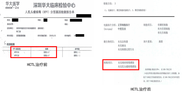 患者一:女,李某,38岁,HPV58型。 经过三次HCTL治疗后,转阴。治疗期间无任何毒副作用。随访时患者主诉:“现精神体力充沛,面色红润,非常高兴。现在患者状态良好,持续配合治疗。
