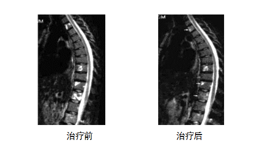 这是一例晚期合并骨转移的乳腺癌患者接受靶向性T细胞治疗前后的对比。接受治疗前,脊柱有多处转移灶,剧烈疼痛。