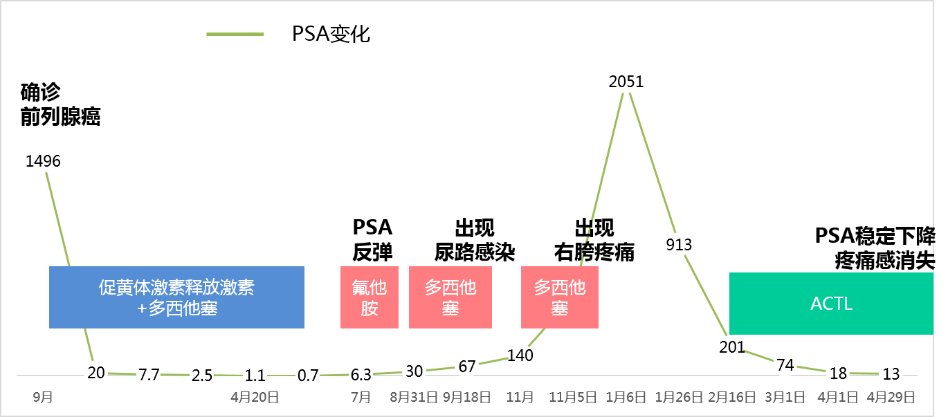 张先生在激素治疗和化疗治疗后,PSA在三个月后反弹,继续化疗,但仍无改善,并相继出现尿路感染和右跨疼痛。接受六次ACTL科研治疗后,PSA回落,疼痛感消失。