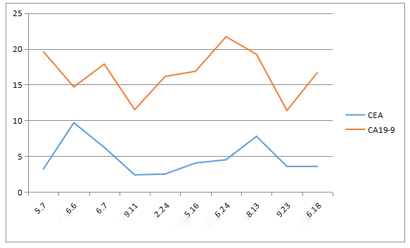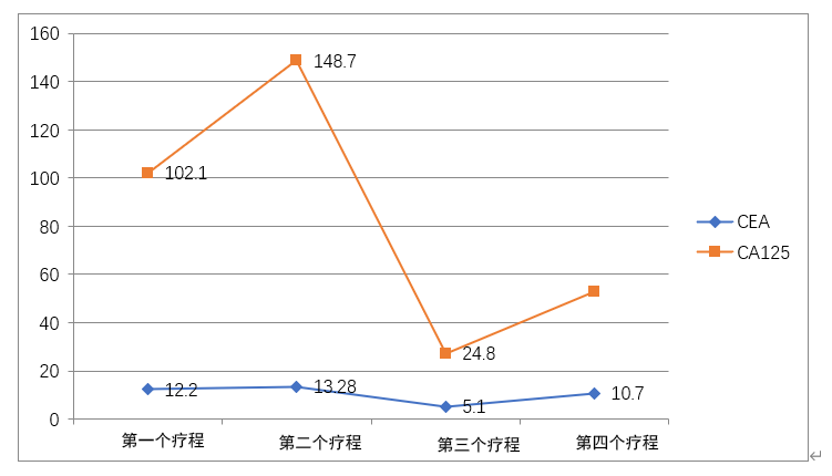 根据血清肿瘤标志物变化曲线图可明显发现,在治疗过程中血肿瘤标志物有短暂反弹,随后其异常水平大幅下降,符合肿瘤生物治疗的特点。