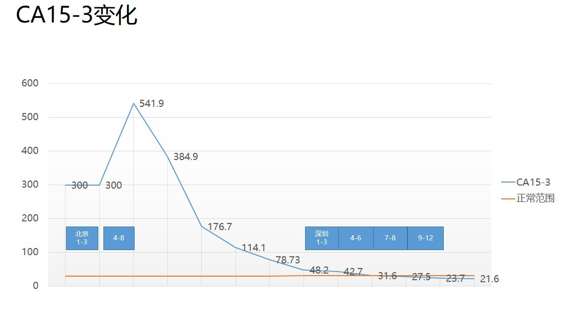 ※ 血清CA15-3的变化是许多ACTL靶向性细胞免疫治疗有效患者的典型表现,在治疗期间,出现血肿瘤标志物的短暂升高时,瘤负荷量下降明显。
