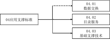 应用支撑标准分体系层次结构见图6,包括数据交换、目录服务和基础支撑技术3个二级类目。