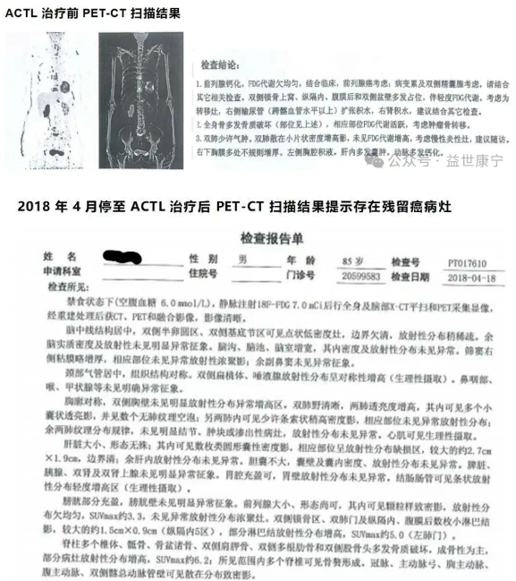 案例385岁时发现前列腺癌,已经出现全身淋巴结和骨转移,并累及肾脏和膀胱、盆腔积液。格里森评分为8分(5级),不能自主活动。2017年2月开始单用ACTL治疗。治疗2个月后血清PSA和瘤负荷量开始明显下降。同年12月血清PSA恢复正常。2018年4月停止ACTL治疗时,仍有残存癌症转移病灶。2023年患者感染新冠,痊愈后复查没有发现任何癌症病灶。提示ACTL治疗可能有后续效应,发挥该作用的细胞可能是记忆性T淋巴细胞。
