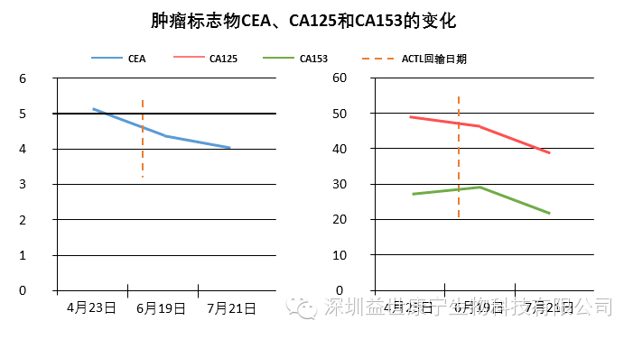 在没有其它治疗手段情况下,患者接受了ACTL免疫细胞治疗。采血患者外周血制备ACTL免疫细胞,患者于6月17日接受了第一次回输,并按ACTL科研治疗方案共接收了三次回输。