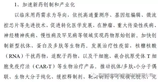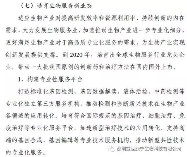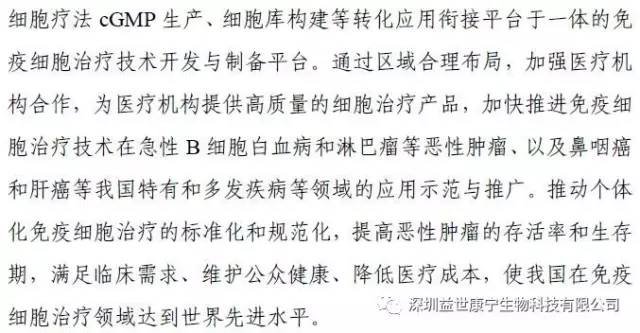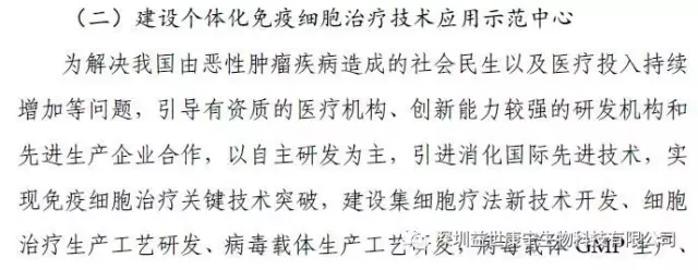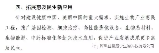 规划提出:十三五将拓展惠及民生新应用,针对建设健康中国、美丽中国的重大需求,实施生物产业惠民工程,推广基因检测、细胞治疗等新兴技术应用,促进产业开展成果更多惠及民生。将建设个体化免疫细胞治疗技术应用示范中心、基因技术服务中心。