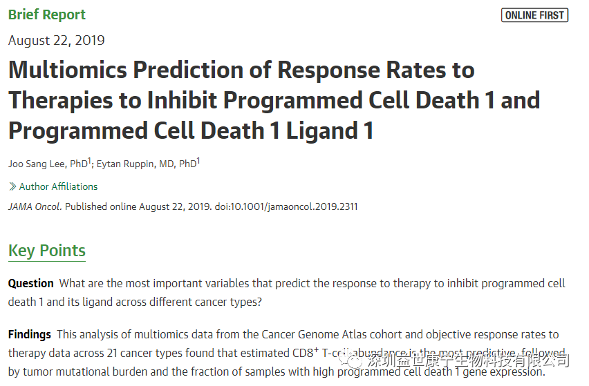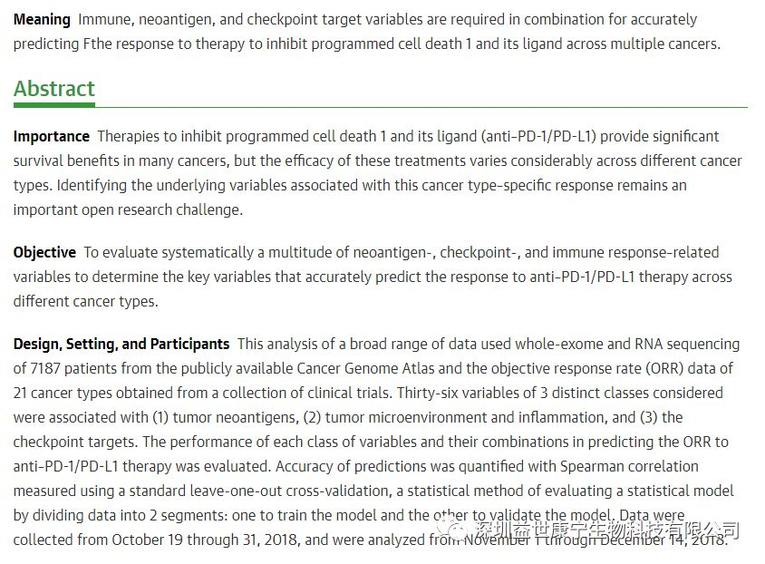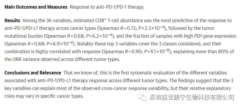 的研究工作。该项非常有价值的研究成果发表在今年8月份的JAMA Oncology。 在研究中他第一时间获取了二项数据: (1)癌症基因图谱中7187名癌症患者的整个外显子基因和RNA序列; (2)21种癌症的PD-1和PD-L1单抗临床试验的客观反应率(objective response rate, ORR)。 顺利获得系统性地评估与新抗原、免疫检查点(checkpoint)以及免疫反应有关的36项变量(分为3个等级)后,得出研究结论:CD8+ T 细胞的丰度是预测疗效的主要指标(Spearman R = 0.72; P < 2.3 ×10-4),其次是肿瘤突变程度(Spearman R = 0.68; P < 6.2 × 10-4)以及标本的PD-1基因的高表达(Spearman R = 0.68; P < 6.9 × 10-4)。将免疫、新抗原以及免疫检查点靶标结合考虑,则能够更加准确地预测80%以上治疗的ORR。但他也承认不同的肿瘤类型中预测指标可能有所不同。例如,对于恶性黑色素瘤和肾癌等恶性肿瘤,则CD8+ T 细胞的丰度是最为可靠的预测指标。但现在这项检测由于未实现标准化,从而导致许多医院的这项检测非常不稳定和不可靠,失去了临床价值,应该尽快改善。当被问及癌基因图谱中有多少东亚患者的数据,他承认在数据中占比很少。临床实践证明CD8+ T 细胞的丰度在恶性肿瘤治疗中是非常重要的。数据也显示将抗原特异性CD8+T细胞与PD-1单抗联合应用时,疗效明显提高。但不幸的是毒副作用也明显提高,尤其以细胞因子释放症为甚。因此,降低抗PD-1和PD-L1单抗疗法的毒副作用仍然是临床急需解决的难题。