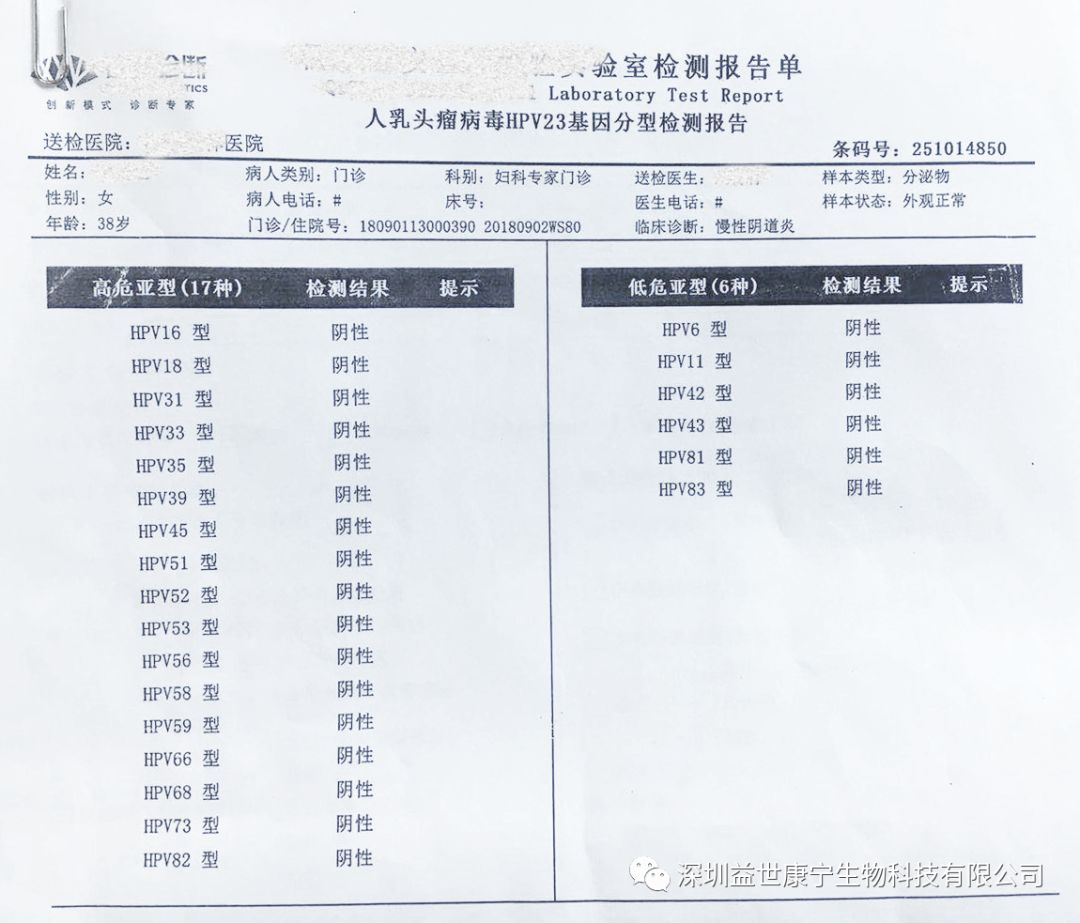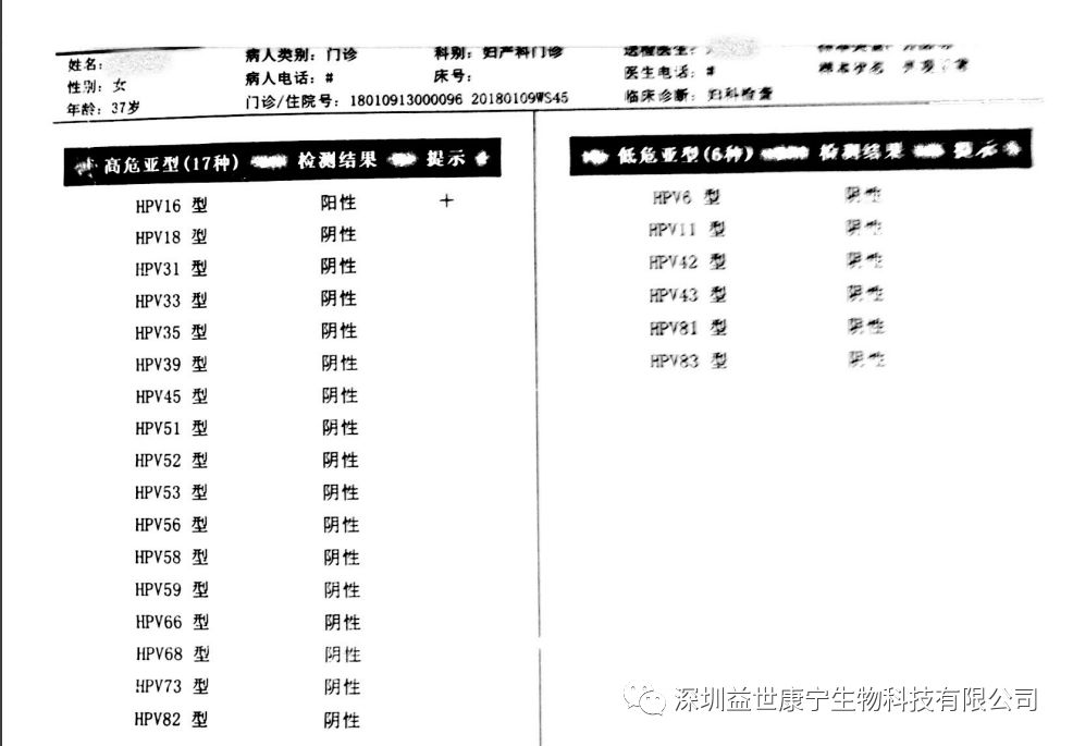 HCTL治疗一个月,即两次HCTL治疗后,患者阴部瘙痒和异味逐渐减弱,病情明显好转。治疗三个月,即五次HCTL治疗后复查,检验报告提示:高危型人乳头瘤病毒16型阴性,提示宫颈癌进展停止。
