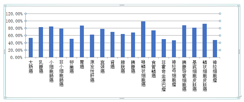 现已发现,Survivin在所有常见恶性肿瘤中表达,包括大肠癌(53.2%)、乳腺癌(83.3%)、小细胞肺癌(85%)、非小细胞肺癌(79.1%)、卵巢癌(51.1%)、胃癌(87%)、肝癌(62%)、宫颈癌(77.7%)、肾癌(69.5%)、膀胱癌(63.8%)、胰腺癌(68%)、非霍奇金淋巴瘤(50%)和神经细胞瘤(47.2%)等等,而在正常组中无表达。这一特性,使得靶向Survivin的免疫治疗能够促进肿瘤细胞的凋亡,正常组织却能不受损伤和影响。根据文献报道,Survivin在各种肿瘤组织中的表达情况如下: